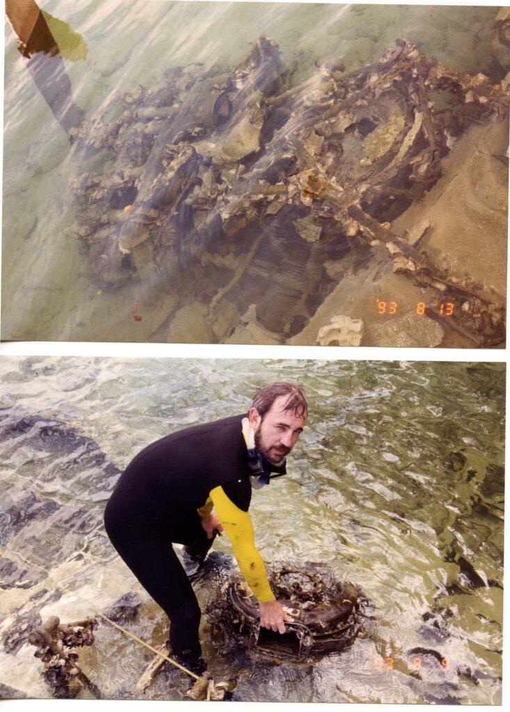 Fifty years after the Shootdown an important random discovery was made after Dr. Pat Scannon found the wing lying next to an island in the lagoon. He wondered about the fate of the crew and set to work identifying and researching the crew’s recovery. In his search, chronicled in a book “Vanished” by Wil Hylton he found the nose of a B-24 off the north shore of Koror. He correctly deduced that it was from Dixon’s ship ‘603. He was unable to find the main part of the ship seen burning down in all of the photos. Eyewitnesses on the day of the crash reported that it did indeed land on the island in a built-up area of Koror.