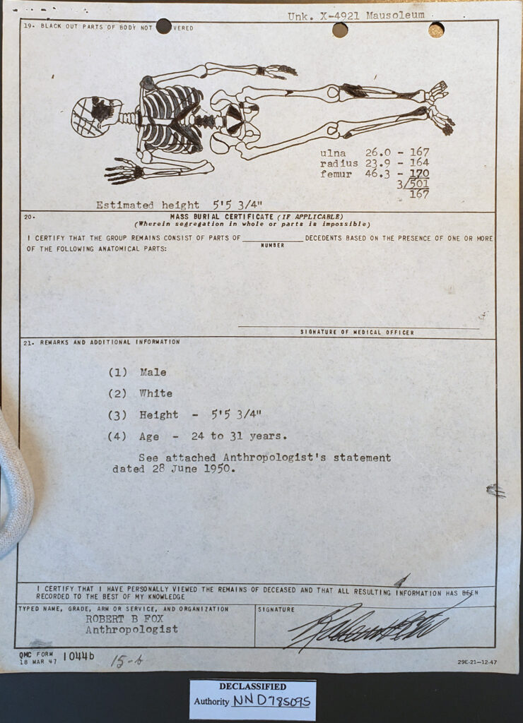 This group burial file is stored at NARA College Park, Record Group 92 under Zachary Taylor National Cemetery Group Burial Files 1948-1950. It is the most consequential discovery in the case since the finding of the aft fuselage debris field. It is over 200 pages and details the recovery and repatriation of remains from first discovery to post-burial. It contains some letters from survivors. This file is searchable. As you can see it also contains graphical depictions of the bones recovered.