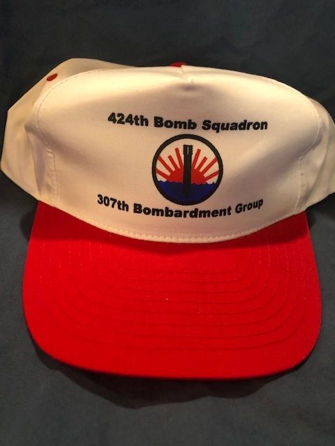 The 424th Bomb Squadron Cap White on Red 8 line stitched bill Adjustable sizes Decorated with the logo of the 424th Bomb Squadron Patch